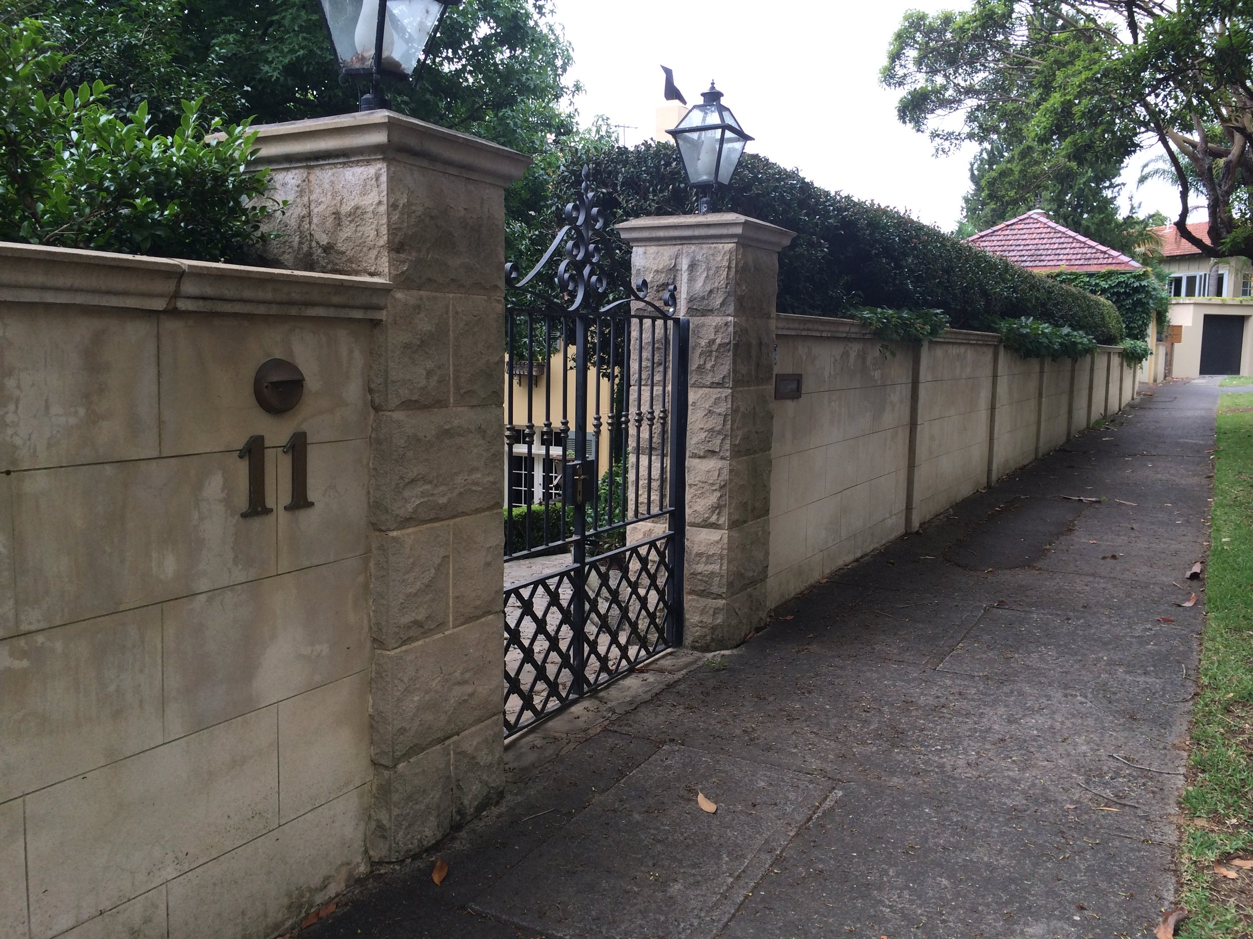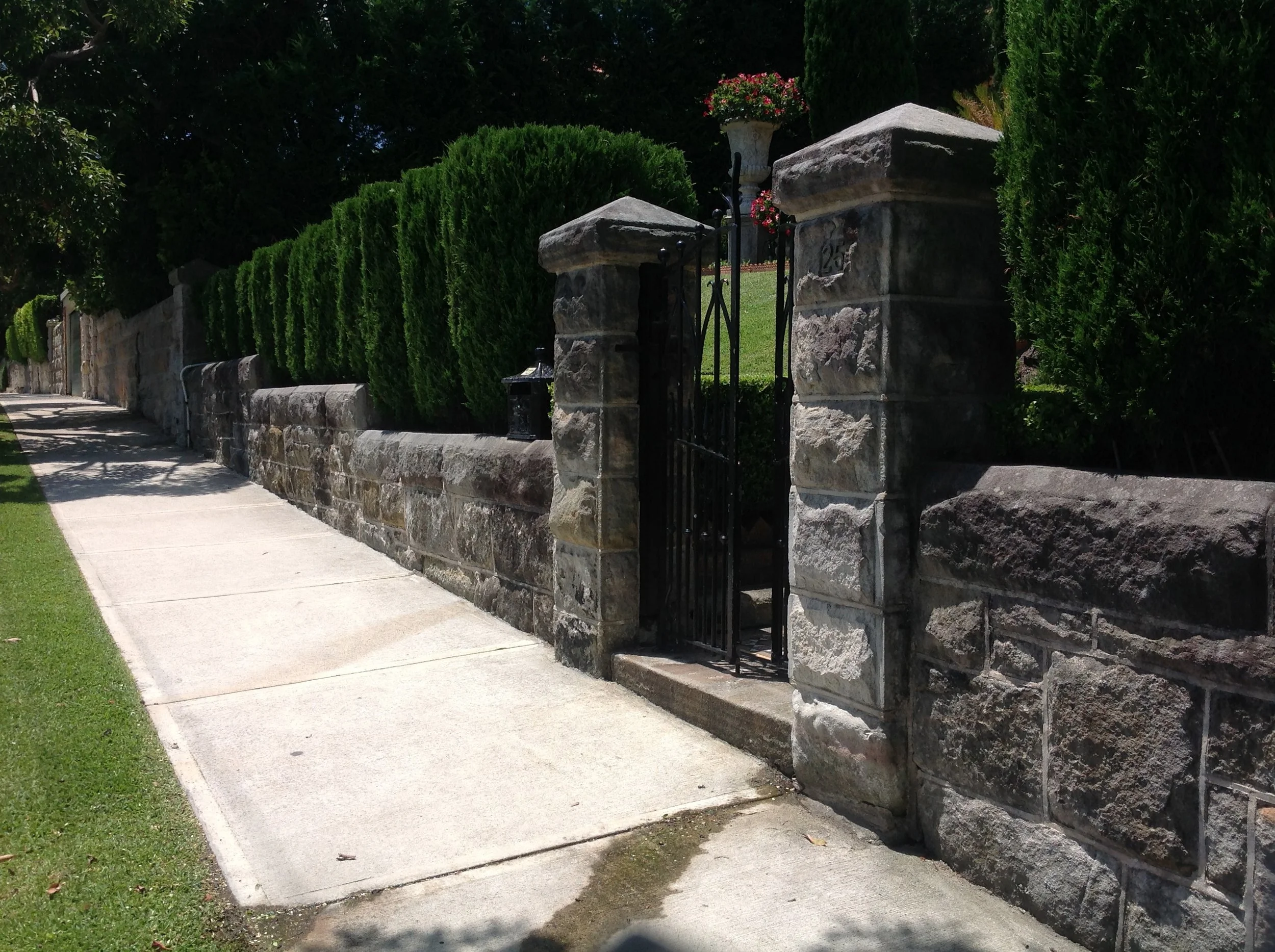 Stone wall with metal gate and trimmed hedges lining sidewalk