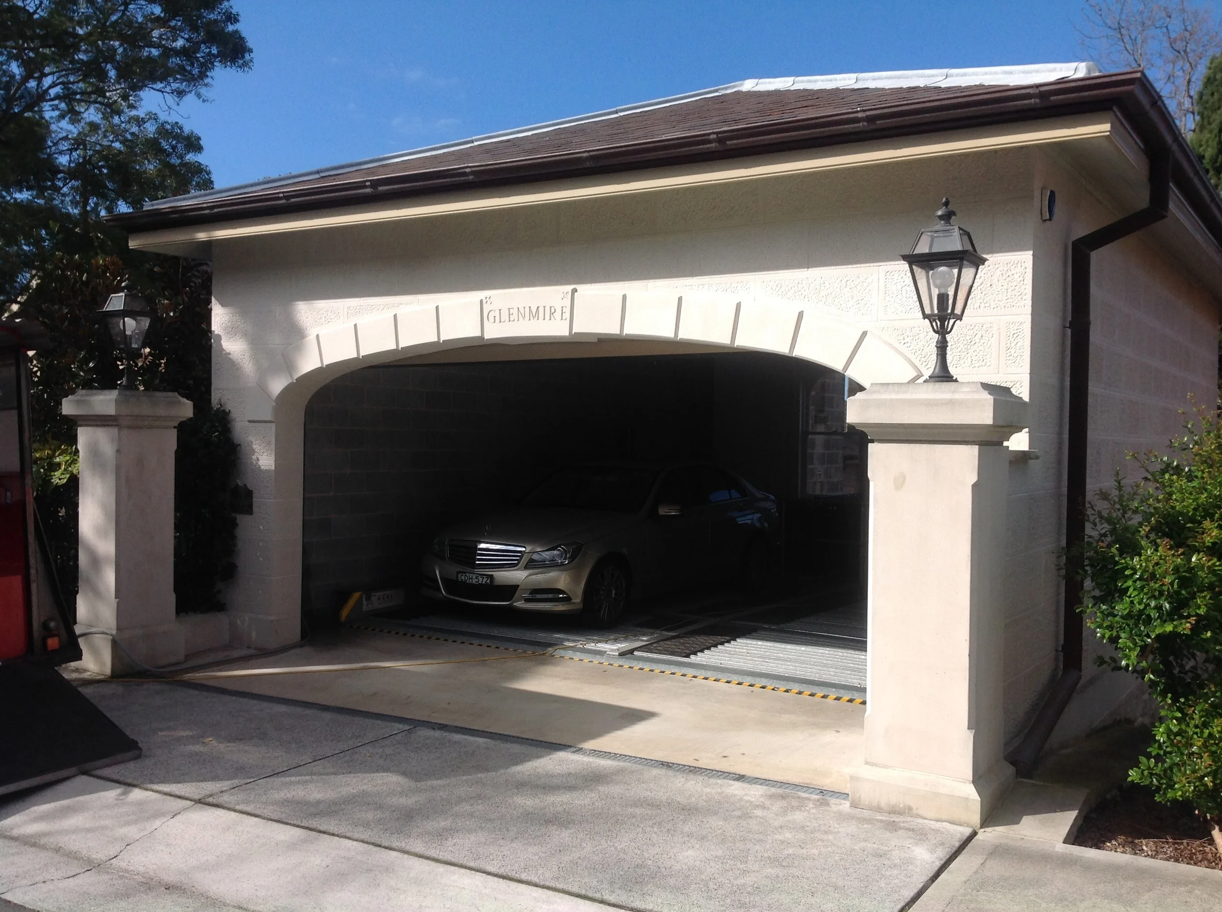 Car parked inside an open garage with the word 'GLENMIRE' above the entrance. The garage has stone pillars and decorative lamps.