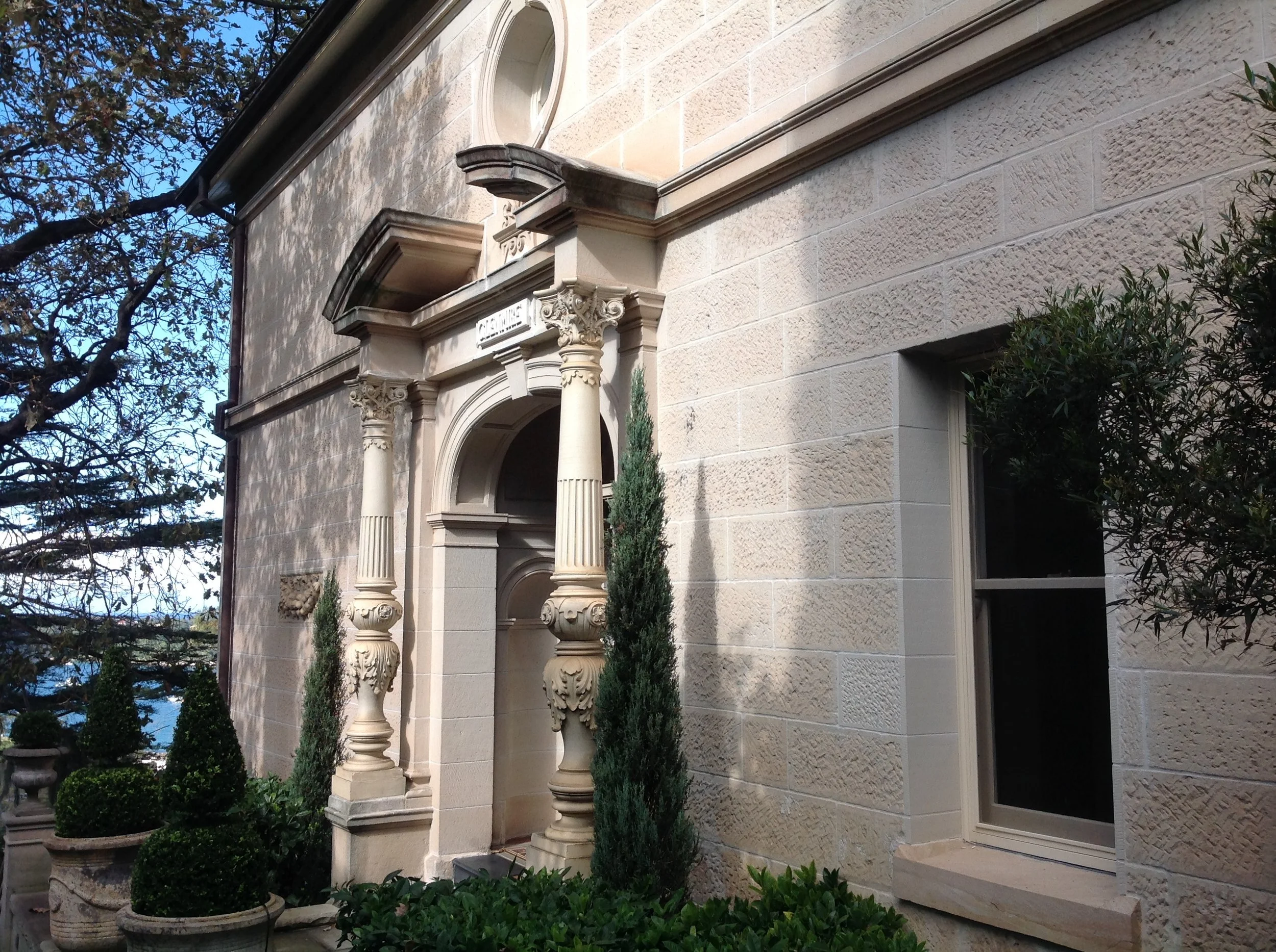 Elegant historic building entrance with ornate columns and arch, surrounded by manicured shrubs and trees.