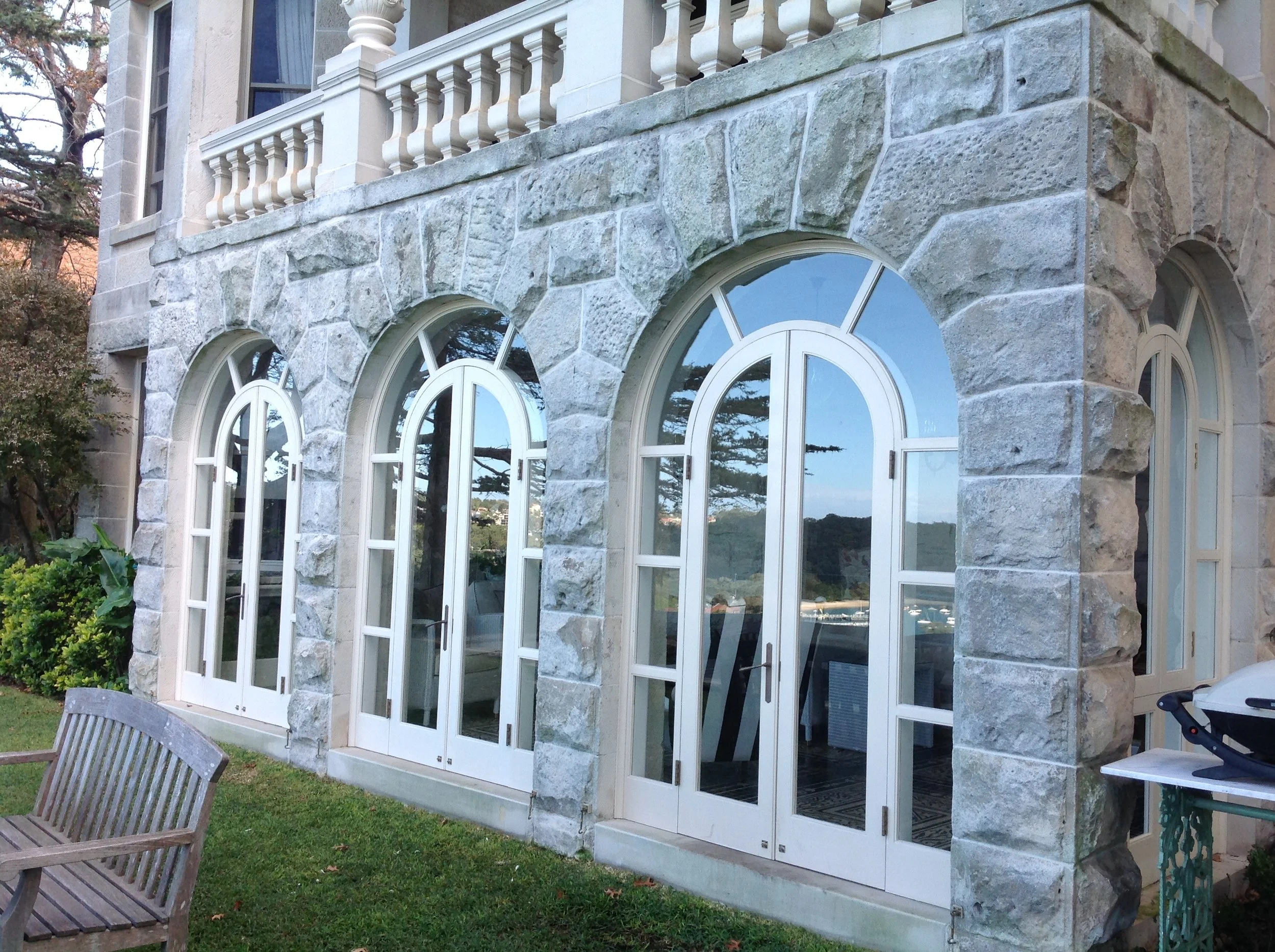 Stone building facade with arched windows and glass doors, balcony with balustrade, and a wooden bench on the grass.