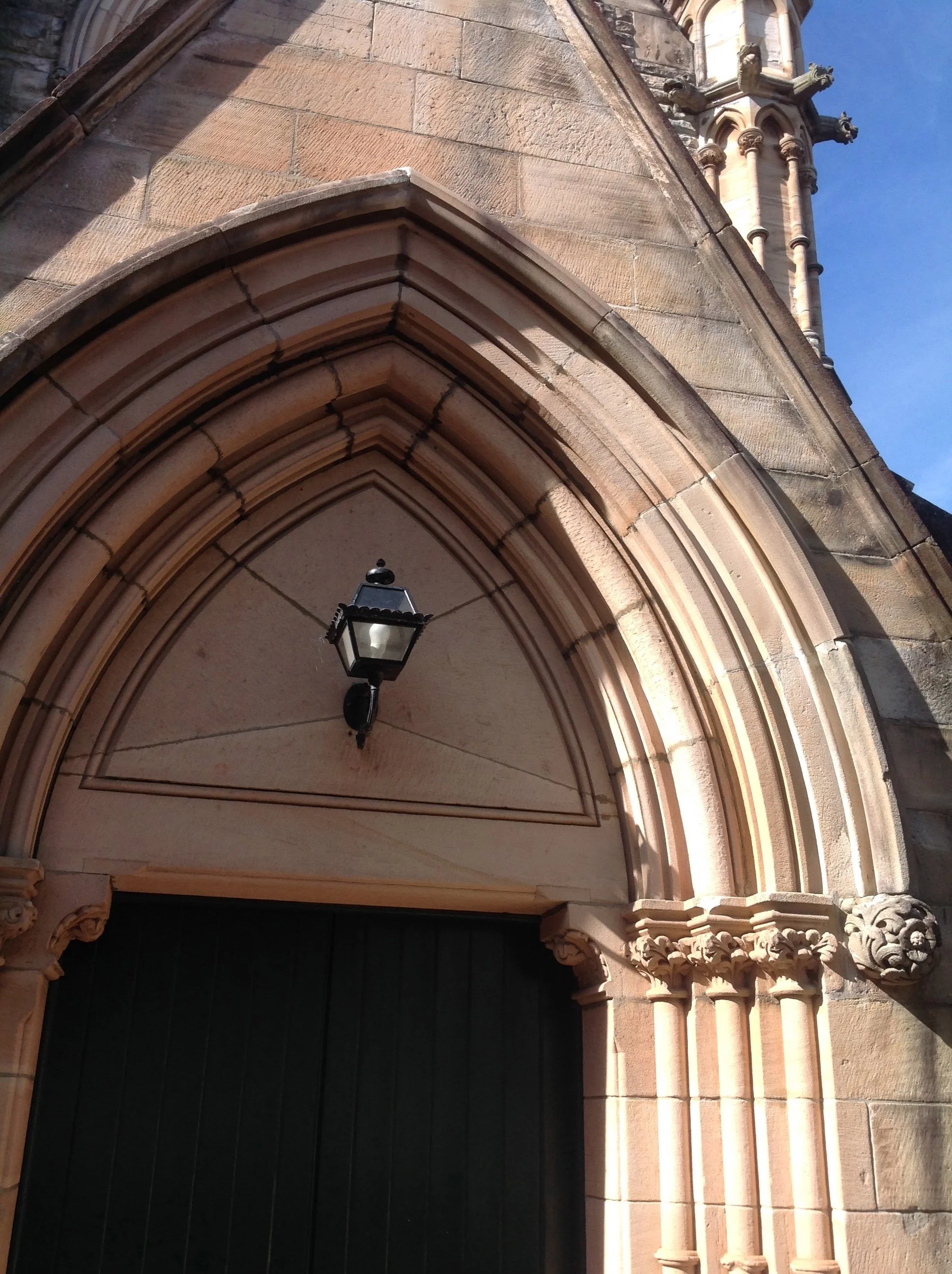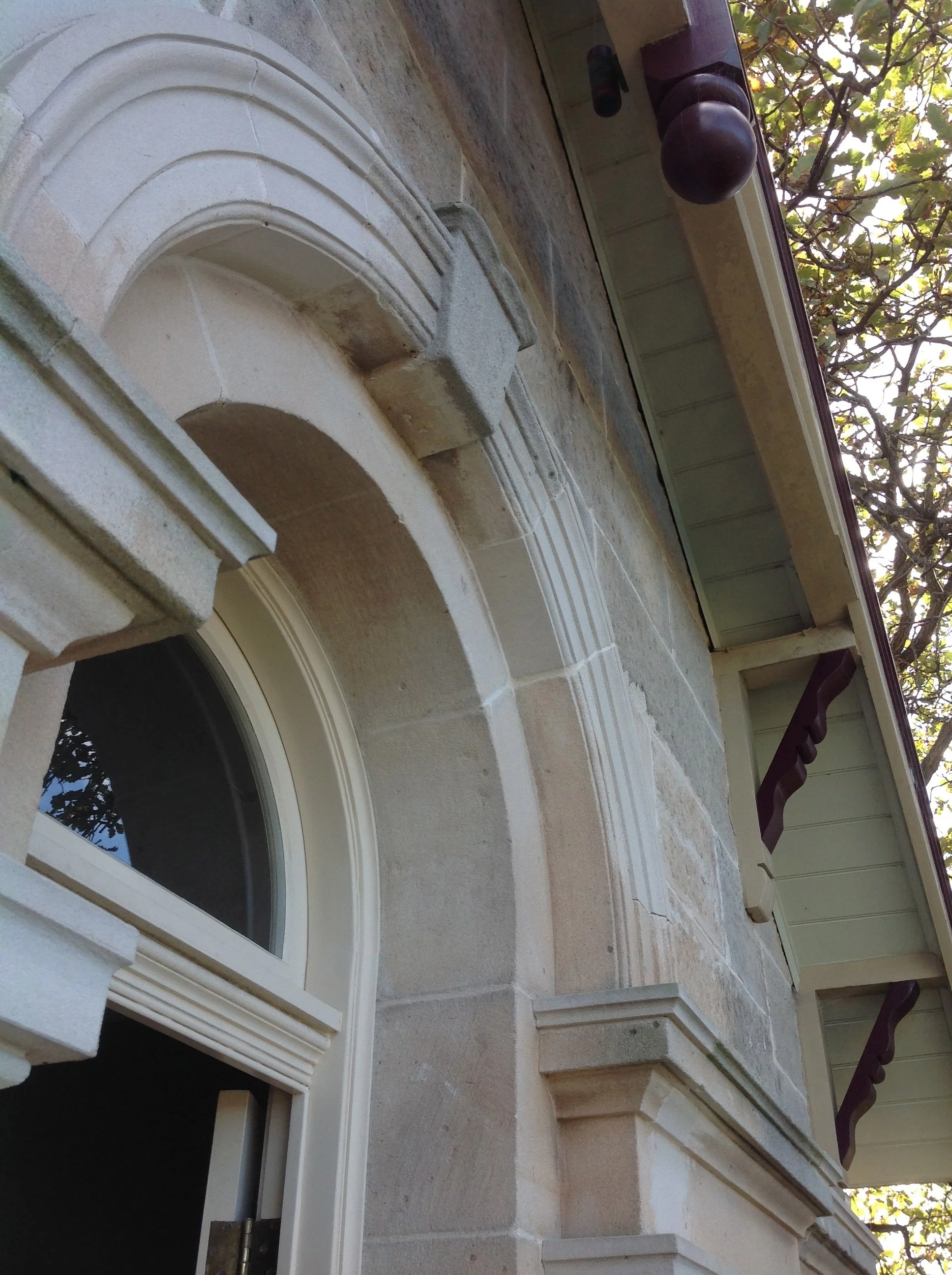 Close-up of an architectural stone arch detail with decorative molding and part of a building's roof with wooden brackets.