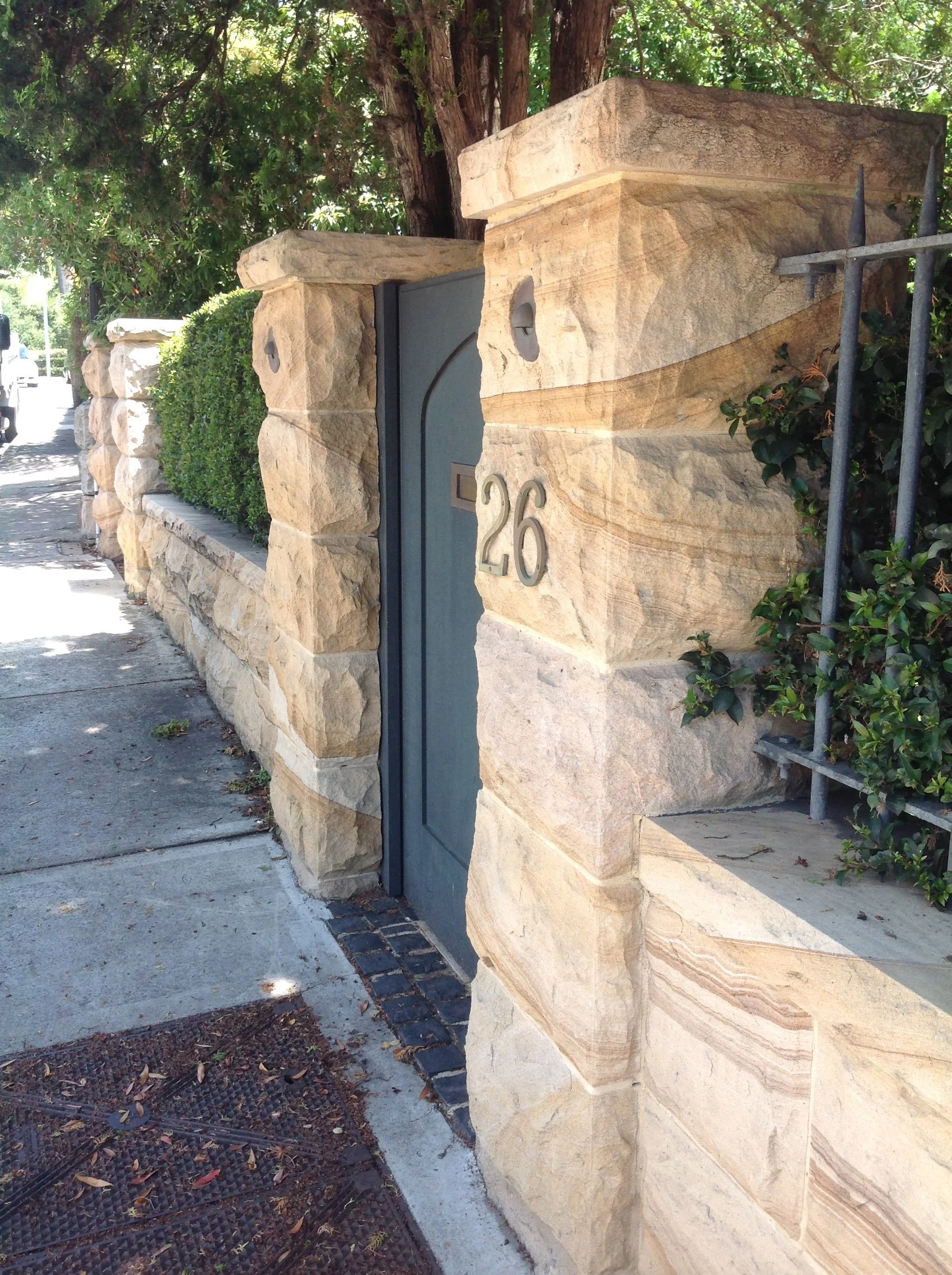 Stone wall with an iron gate, number 11, and sidewalk flanked by greenery.