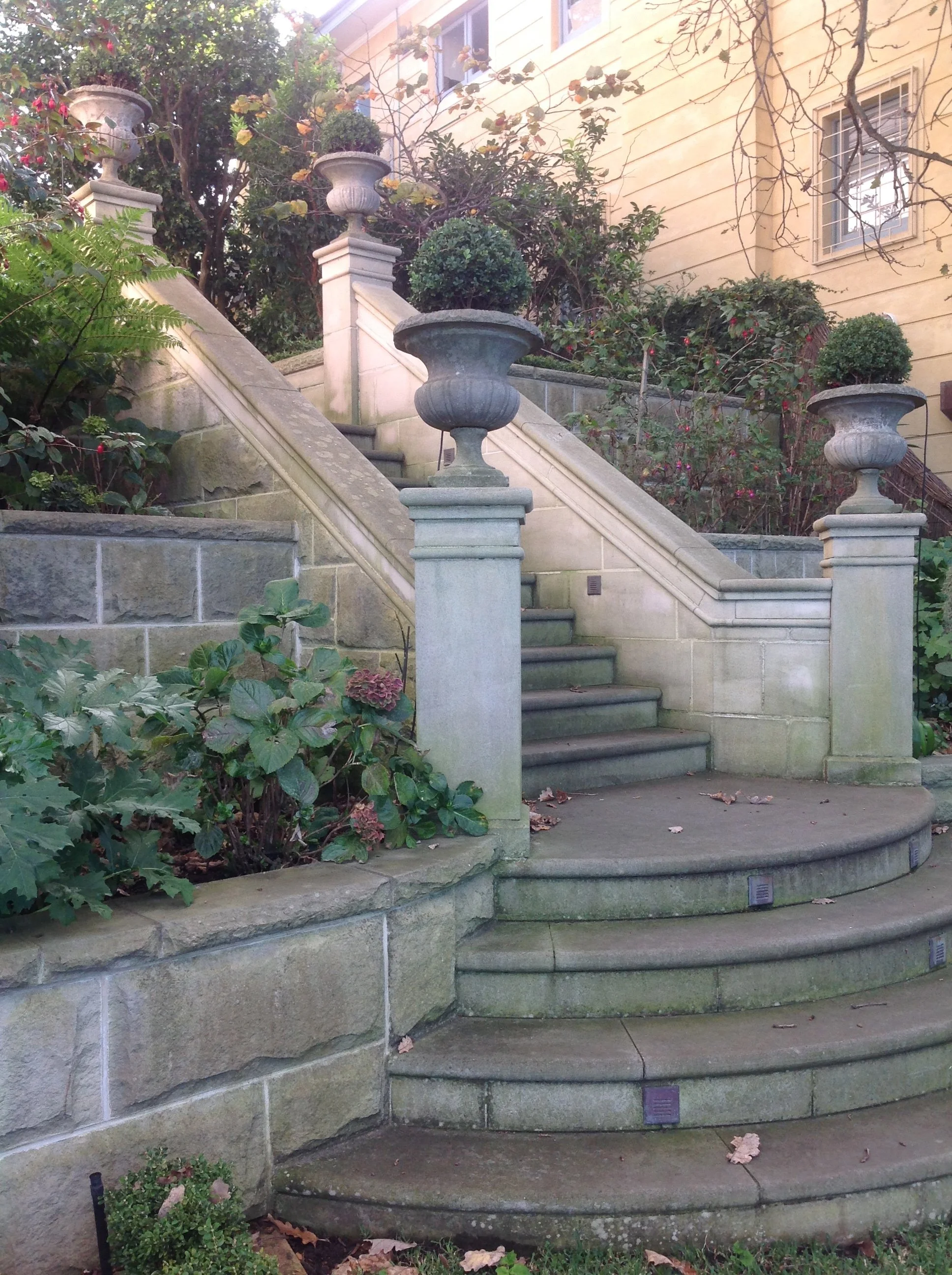 Stone staircase with two-level steps, surrounded by greenery, leading to a building with a yellow facade. Large stone urns with topiary plants are placed on columns along the stairs.